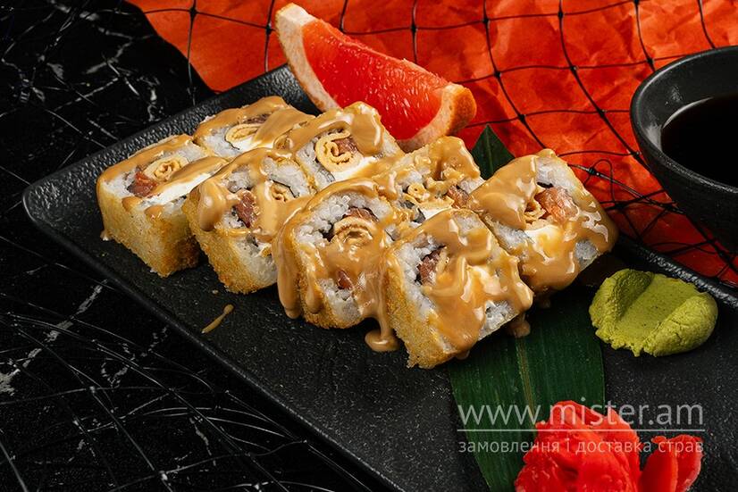 Гарячий рол з ніжним лососем і омлетом, доповнений сиром Філадельфія та соусом темпура.