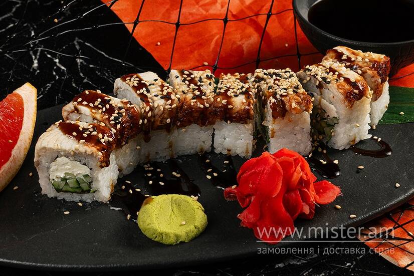 Рол з ніжним вугром, солодким манго, свіжим огірком і сиром Філадельфія, доповнений соусом унагі та кунжутом.