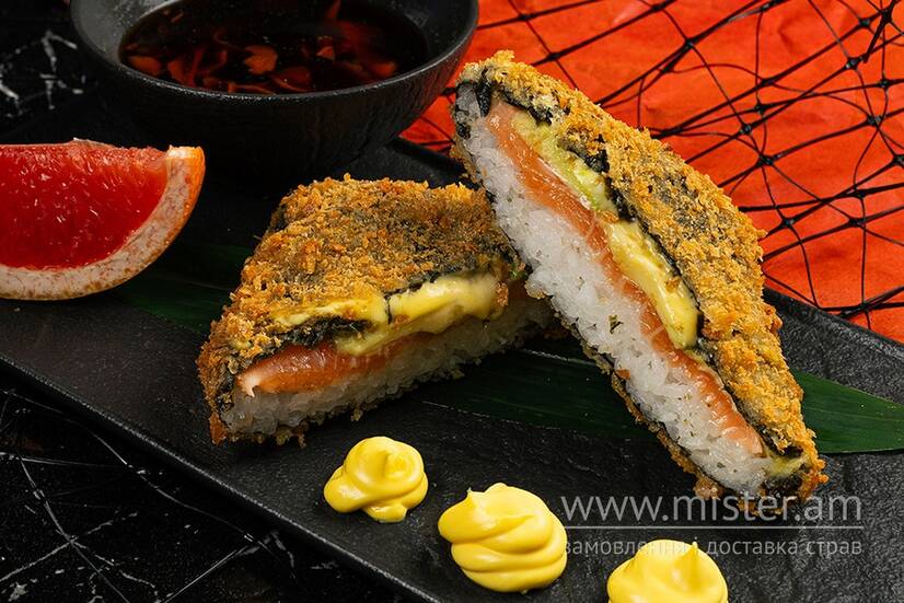 Гарячий сендвіч рол з ніжним лососем, авокадо і тостерним сиром, доповнений сирним соусом.