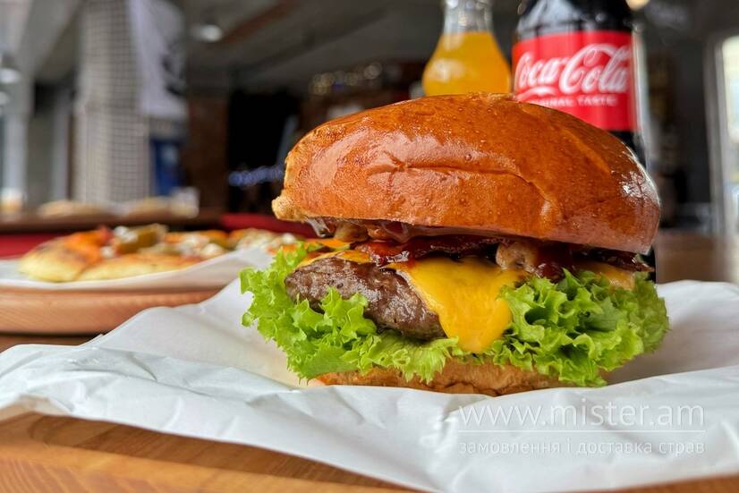 Булочка бріош, котлета (яловичина або курятина), сир чедер, соус ранч, карамелізована цибуля, квашені огірки, листя салату.