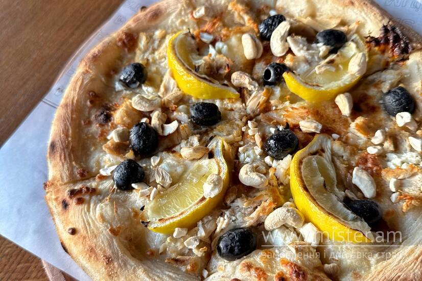 Тісто, вершкова основа, базилік, сир моцарела, сир пармезан, сир фета, бебі шпинат, маслини, куряче філе, лимон, горіхи кеш`ю, трюфельна олія.
