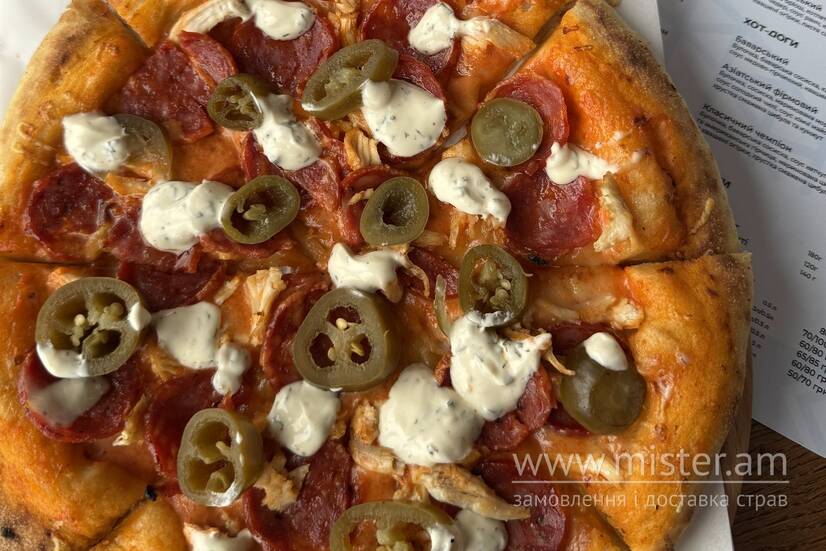 Тісто, томатна гостра основа, соус кімчі, сир пармезан, куряче філе, салямі папероні, перець халапеньо, паприка, соус ранч.