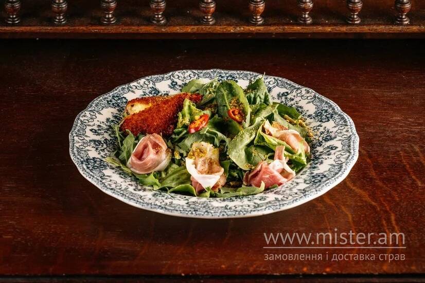 Мікс салат, сир імеретинський, ягідний соус, горіхи, лорі, чилі.