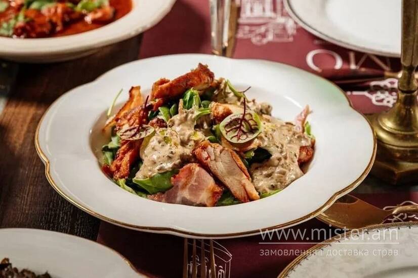 Куряче стегно, мікс салат, вершковий соус з грибами, томати, бекон.