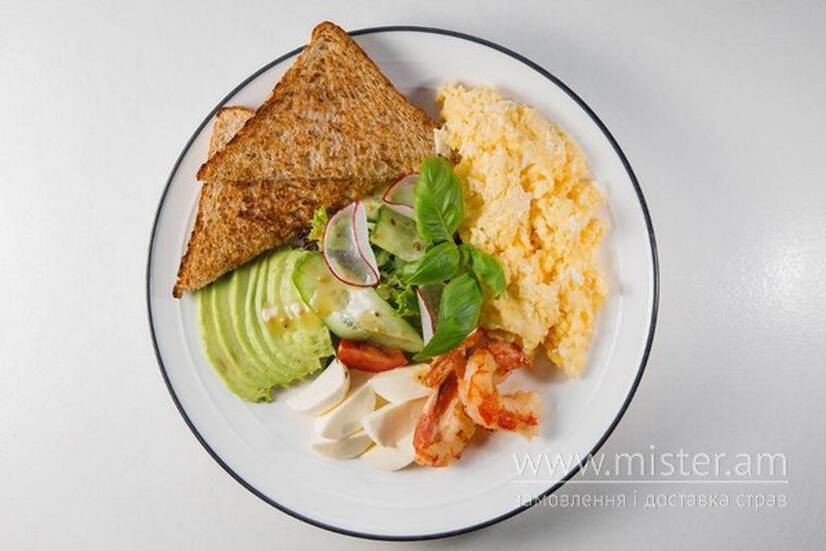 Тераса Яйця-скрембл з авокадо, креветками та моцарелою