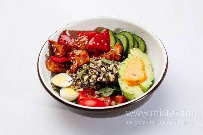Салатний мікс, помідор чері, огірок, яйце перепелине, кіноа, булгур, авокадо, куряче бедро, перець болгарський, соус спайсі, соус кисло-солодкий, кунжут.