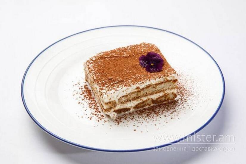 Вершки, маскарпоне, печиво савоярді, кава espresso, коньяк, порошок какао.