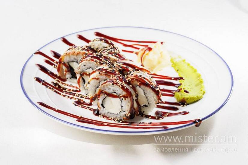 Вугор, редька маринована, омлет томаго, кунжут, крем-сир, норі, рис, соус унагі.