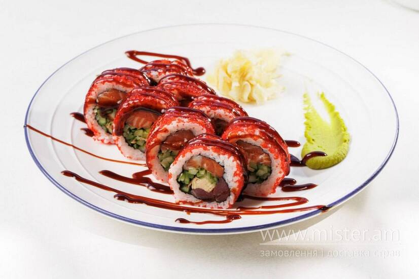 Лосось, тунець, свіжий огірок, ікра masago, омлет томаго, норі, рис, соус унагі.