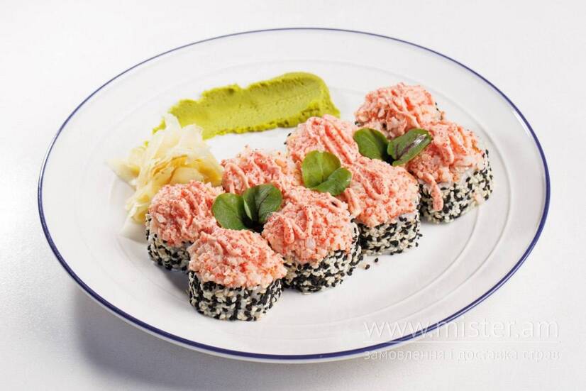 Креветка, авокадо, свіжий огірок, кунжут, крем-сир, норі, рис, соус спайсі.