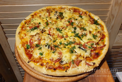 ковбаса домашня, печериці, помідор, зелень, сир, кукурудза