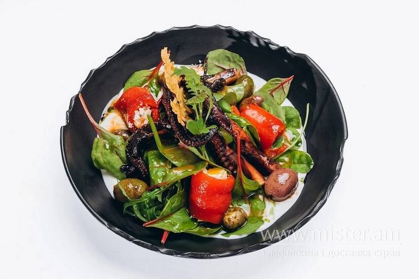 Мікс салату на йогуртовій подушці з восьминогом, оливками та фетою, яка обгорнута в печений перець.