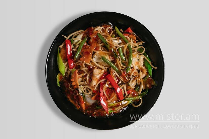 Смажена яєчна локшина з куркою, болгарським перцем, стручковою квасолею, цибулею порей, пекінською капустою, грибами мун, морквою зі соусом світ-чілі та кунжутом.