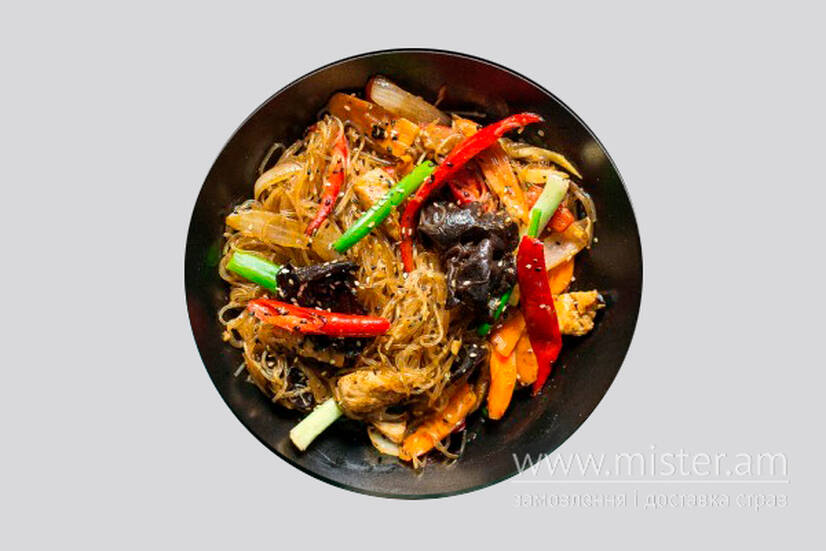 Курка з імбирем, болгарським перцем, грибами муер, морквою, з солодкою та заленою цибулею, зі смаженою скляною локшиною та кунжутом.