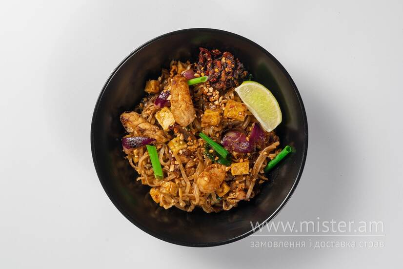 Смажена рисова локшина з яйцем, креветкою, смаженим тофу, солодкою та зеленою цибулею, часником, арахісом в соусі з тамаринду.