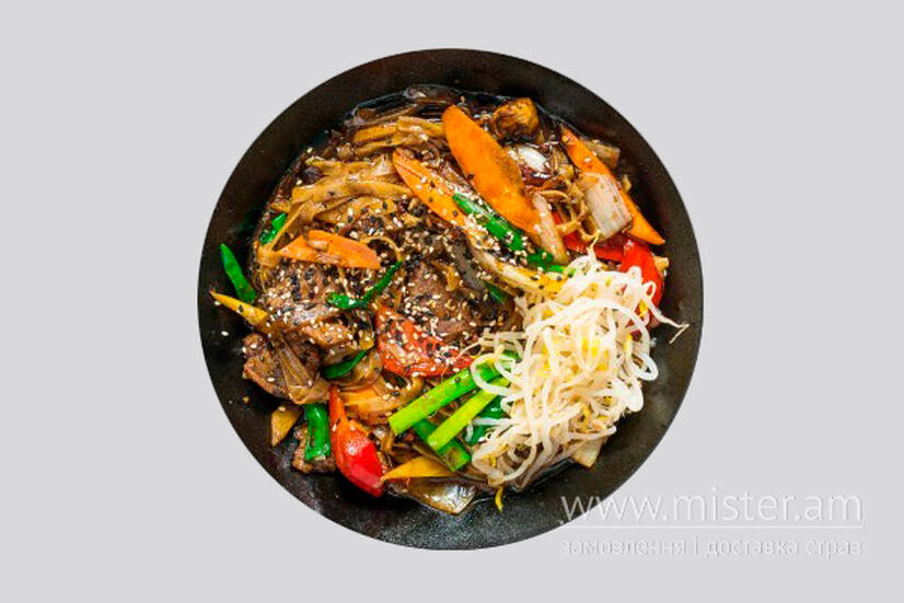 Телятина з пряним сичуанським перцем та тайським Чілі, імбирем, пекінською капустою, морквою, солодкою та зеленою цибулею, часником, грибами гливами, болгарським перцем, арахісом, кунжутом та смаженою рисовою локшиною.