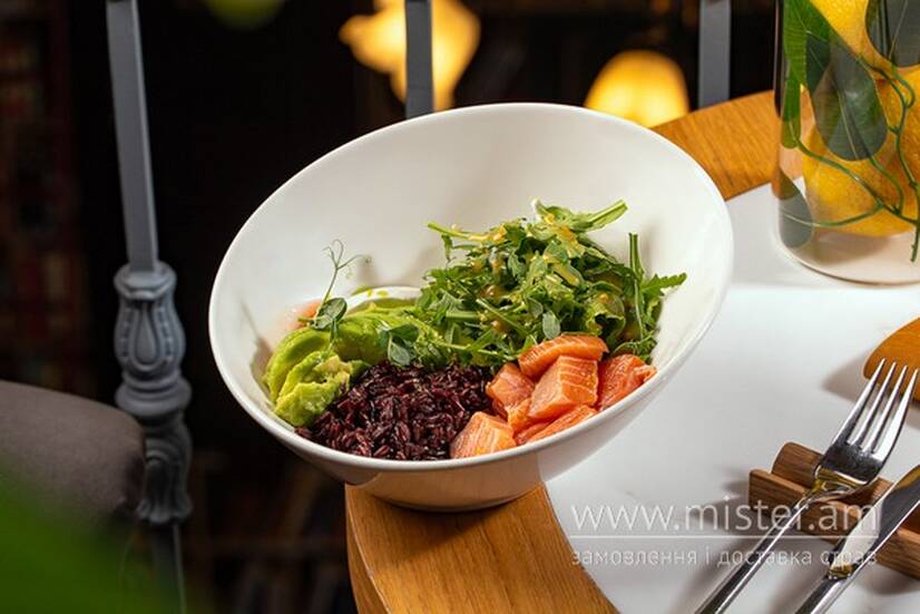 Рис, лосось, авокадо, салат ромен, мус феталіні.