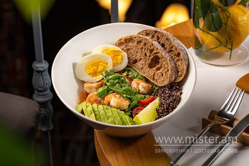 Кіноа, креветка, крем-сир, яйце, авокадо, чері, мікс салату, лимонний дресінг, хліб, соус солодкий чилі.