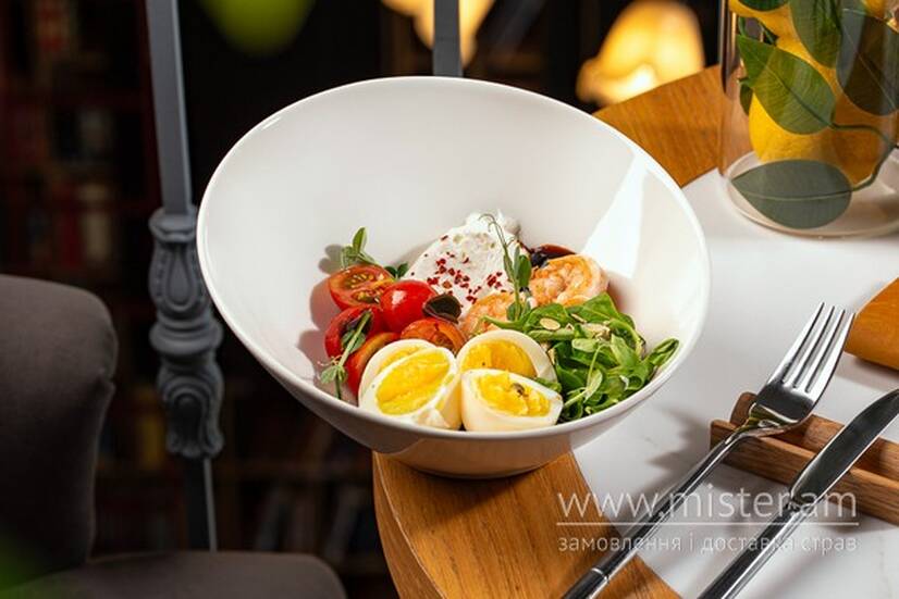 Ніжні яйця з ароматними креветками, обсмаженими з часником і розмарином. Подається з мусом із сиру феталіні, соковитими томатами чері та фірмовим соусом. Вишуканий сніданок із середземноморським акцентом.