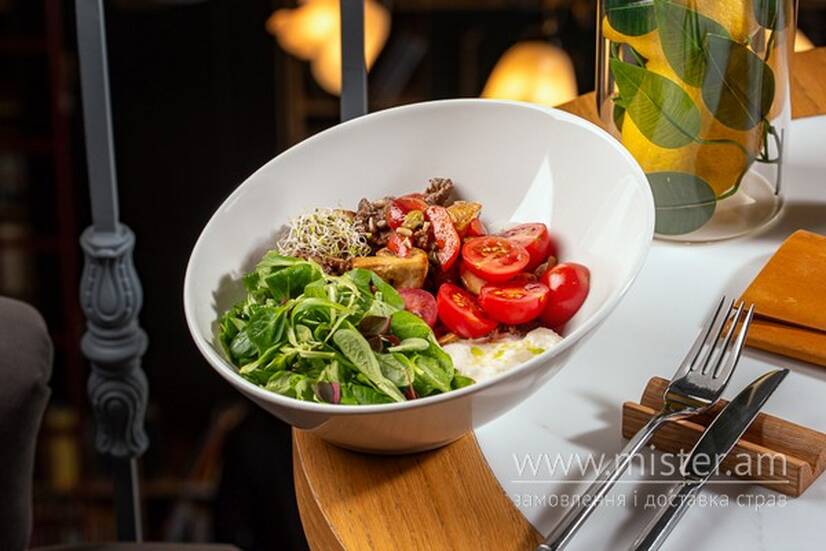 Мікс салату, вирізка телятини, перець, чері, печериці, сир страчатела, соус страчатела, кунжут, спеції, часник.