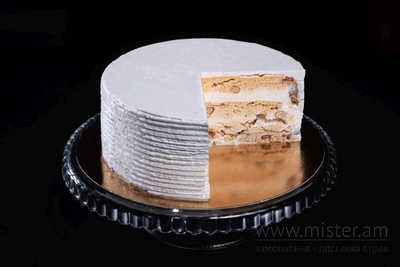 повітряно-горіхові коржі прошаровані білим кремом , оздоблені кокосовою стружкою