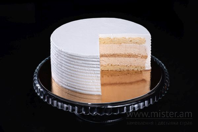 ніжний бісквіт з вершковим кремом зі згущеним вареним молоком, оздоблений завитками з білого бельгійського шоколаду; містить ванільний сироп
