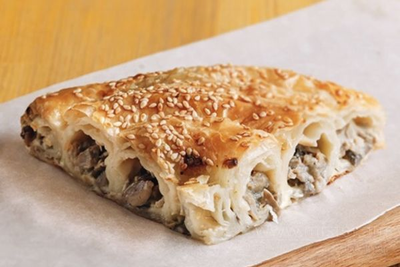 Тісто філло, печериці, цибуля, вершковий соус, суміш спецій.
