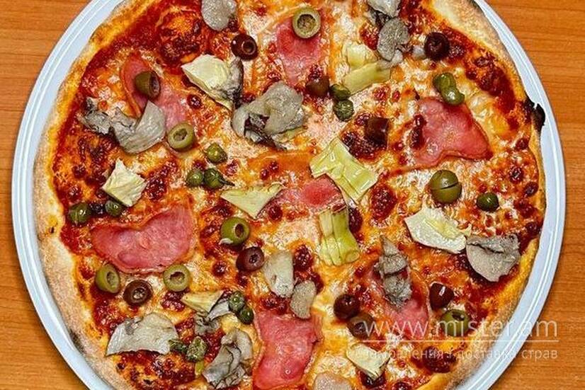 Запечена шинка, артишоки, гриби, оливки, каперси.