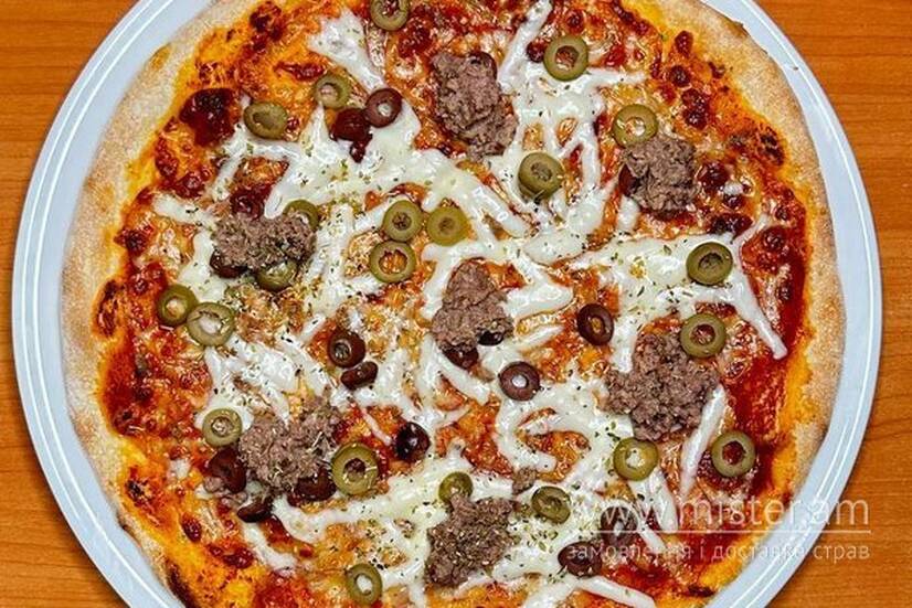 Соус, моцарелла, тунець, оливки, орігано.