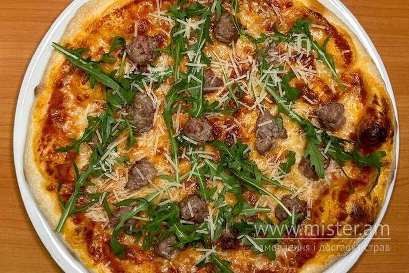 Соус, моцарелла, свіжа ковбаса, пармезан, рукола.