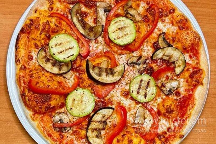 Соус, моцарелла, овочі гриль (болгарський перець, баклажан, кабачок, гриби).