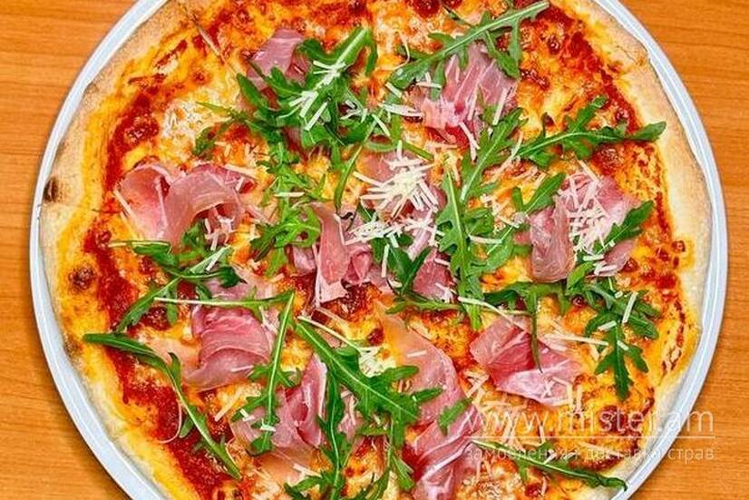 Соус, моцарелла, прошутто, рукола, пармезан.