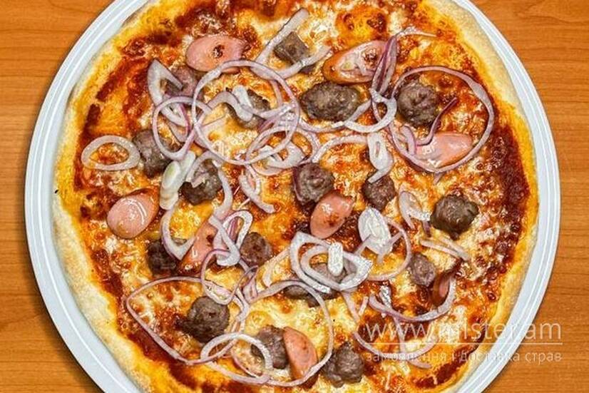 Соус, моцарелла,свіжа ковбаса, сосиски, цибуля.
