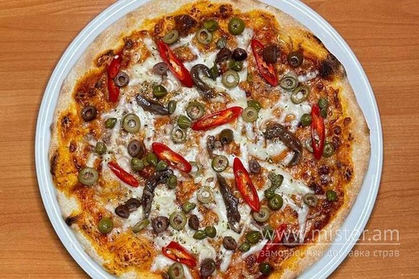 Соус, моцарелла, оливки, каперси, анчоуси, перець чилі.