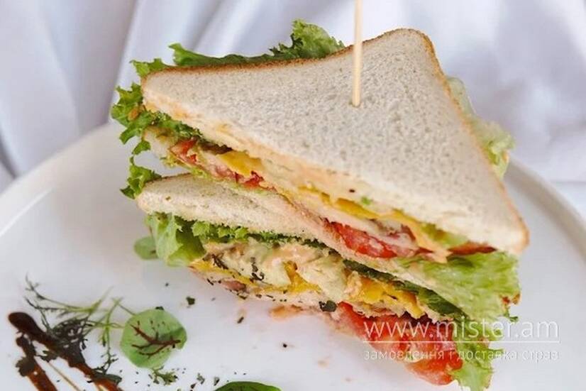 Тостерний хліб, балик копчений, куряче філе, авокадо, сир чедер, листя салату, бургерний соус.