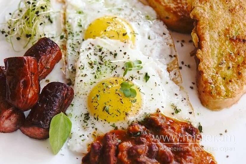 Квасоля в томатному соусі з цибулею, грінки, яйце куряче, баварські сосиски.