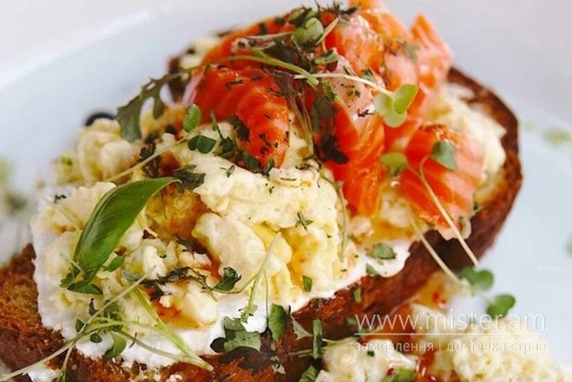 Бріош, крем фета, лосось, яйце куряче, світ чілі.