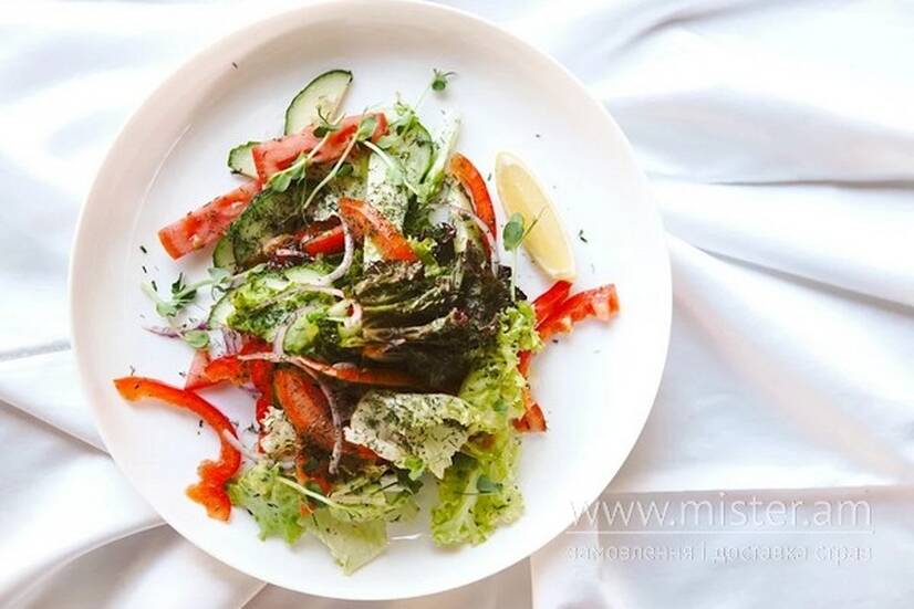 Листя салату, перець болгарський, огірок, помідор, цибуля Марс, оливкова олія.