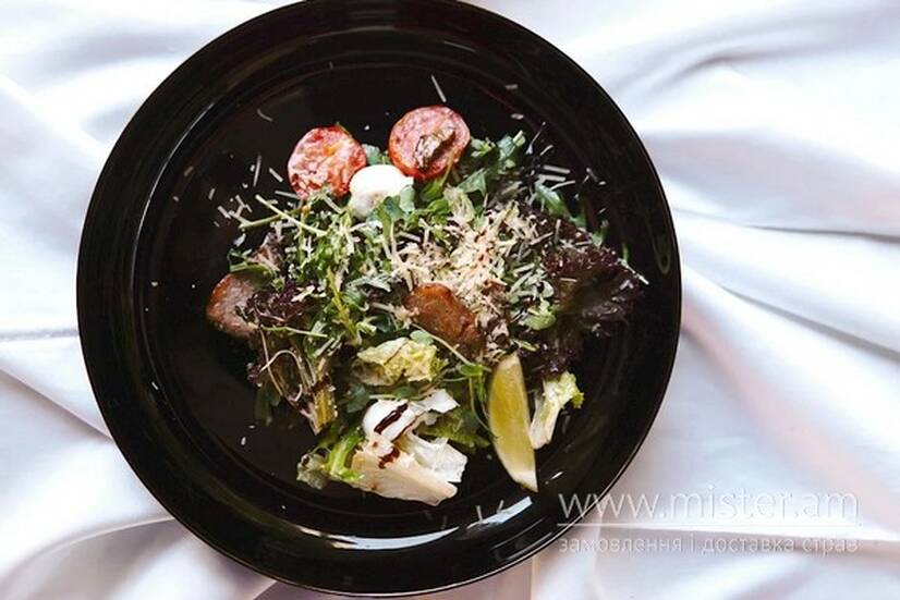 Теляча вирізка, перепелині яйця, чері, листя салату, медово гірчичний соус, пармезан.