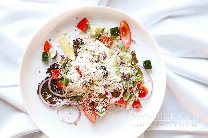 Перець болгарський, огірок, помідор, маслини, листя салату, цибуля Марс, оливкова олія, бринза.
