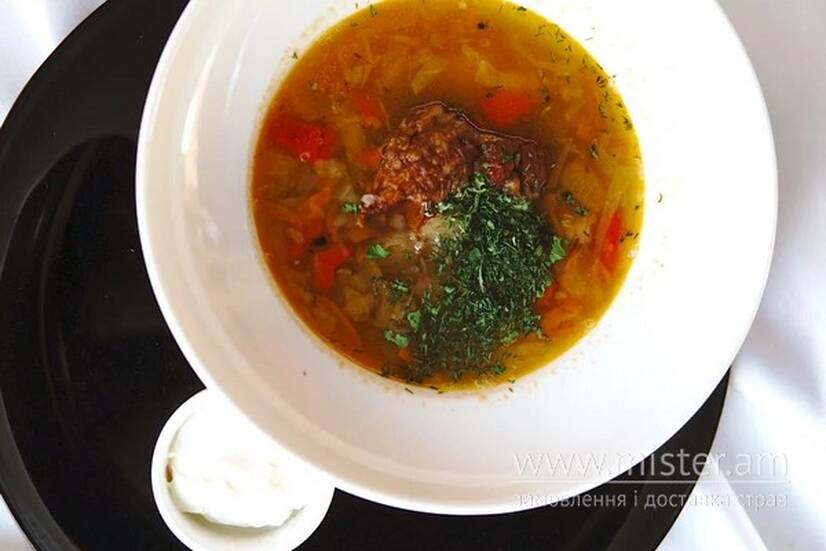 Вирізка свинна, квасоля, цибуля Марс, перець болгарський, морква, ребро копчене, капуста, сметана.