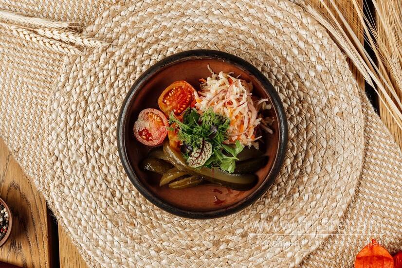 Квашена капуста, мариновані огірки, мариновані помідори, домашня олія.
