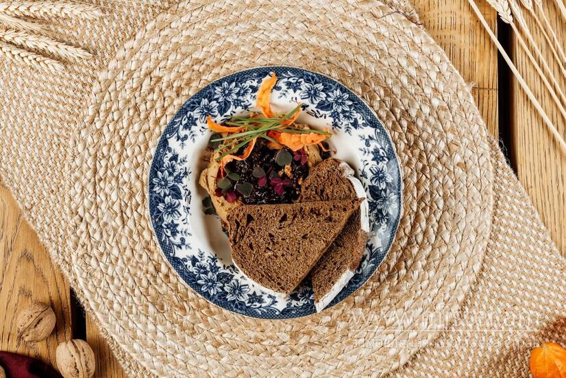 Підкопчений паштет з курячої печінки, варення з червоної цибулі та французької гірчиці, крафтовий хліб.