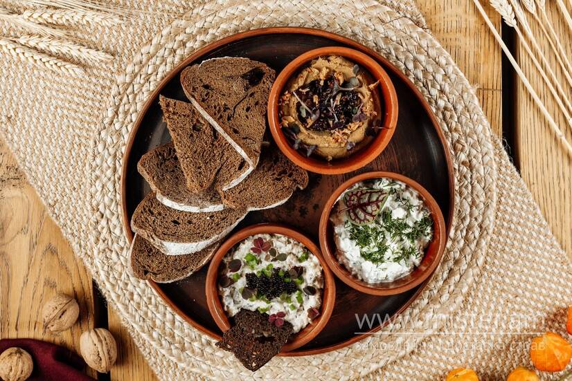 Одеський форшмак, паштет з курячої печінки, сир зі сметаною та зеленню, крафтовий хліб.