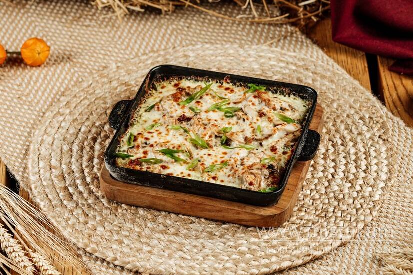Дерун, вершково-цибулевий соус, печена курка, печериці, моцарела.