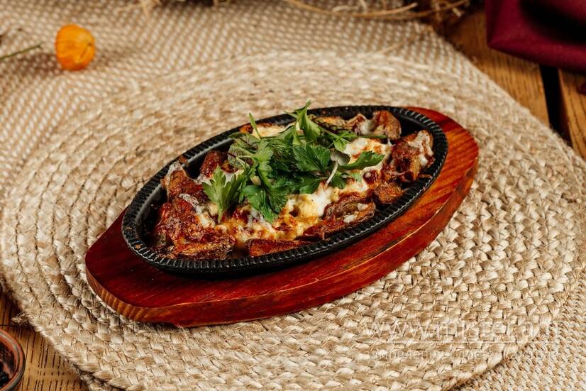 Картопля по-селянськи, курка сувід, засмажка з цибулі та моркви, домашній майонез, моцарела.