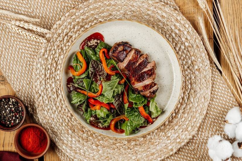 Салат з пряною качкою сувід, печеним перцем та вишневим соусом
