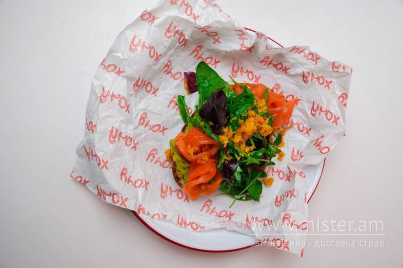 Хліб гірчичний, гуакамоле, лосось слабосолений, салат мікс, дресінг лимонний, темпура.