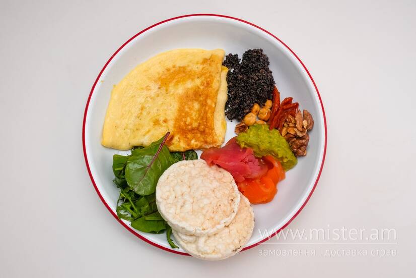 Омлет, лосось слабосолений, тунець копчений, дресінг лимонний, салат мікс, насіння кіноа, гуакамоле, томат в`ялений, горіх волоський, горіх фундук, хлібці рисові.