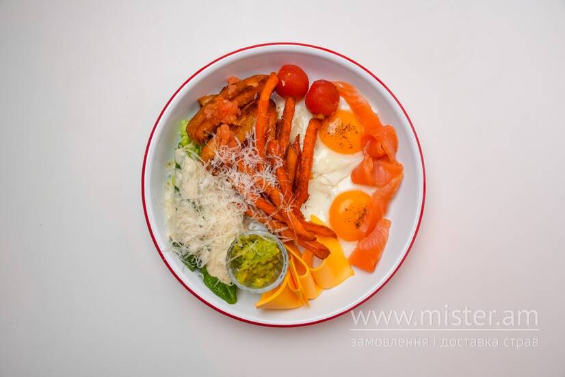 Яйця, салат ромен, томат тертий, лосось слабосолений, батат, гуакамоле, томати чері мариновані, соус цезар, сир пармезан, сир чеддер.